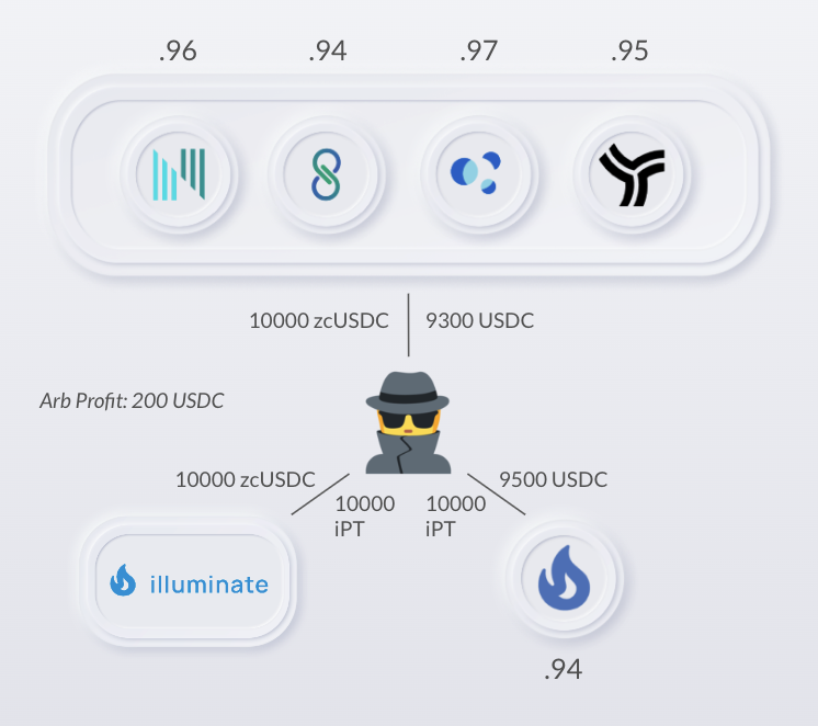 <figure><img src="https://694408789-files.gitbook.io/~/files/v0/b/gitbook-x-prod.appspot.com/o/spaces%2Fhpe4cn6nUrSwzD5udpkV%2Fuploads%2FqNFopkU960jCSWTzPXcX%2FScreen%20Shot%202022-09-06%20at%2012.22.08%20PM.png?alt=media&#x26;token=9a5b746f-ecfc-4779-9d75-a9ca0150ab11" alt=""><figcaption><p>Arbitrageur purchasing Swivel PTs -> Wrapping iPTs -> Selling iPT for profit</p></figcaption></figure>